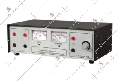 Provides three fixed and one variable D.C. Voltage in one unit. With safety and protection from overload and short circuits. 1. 2.5-20 V DC/2.5 A 2. 5 V DC/3 A 3. 5 V DC/0.5 A 4. 12 V DC/1 A With analog voltmeter and ammeter.