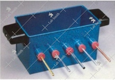 To demonstrate different conductivities of different metals. Rods of 5 different metals and wood, fitted along one side of a metal tank.