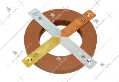 Strips of four different metals fixed on a wooden ring of outer diam. 130 mm and each having a depression for putting wax.
